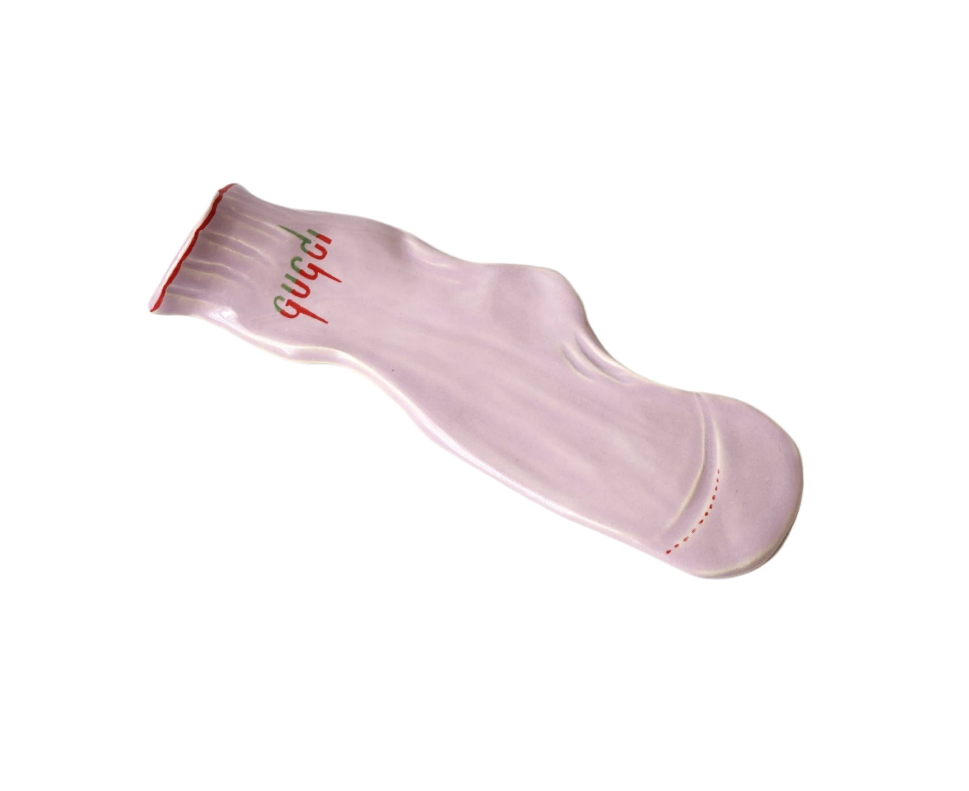 Ceramic sculpture of a sock with Bowie influenced lettering.