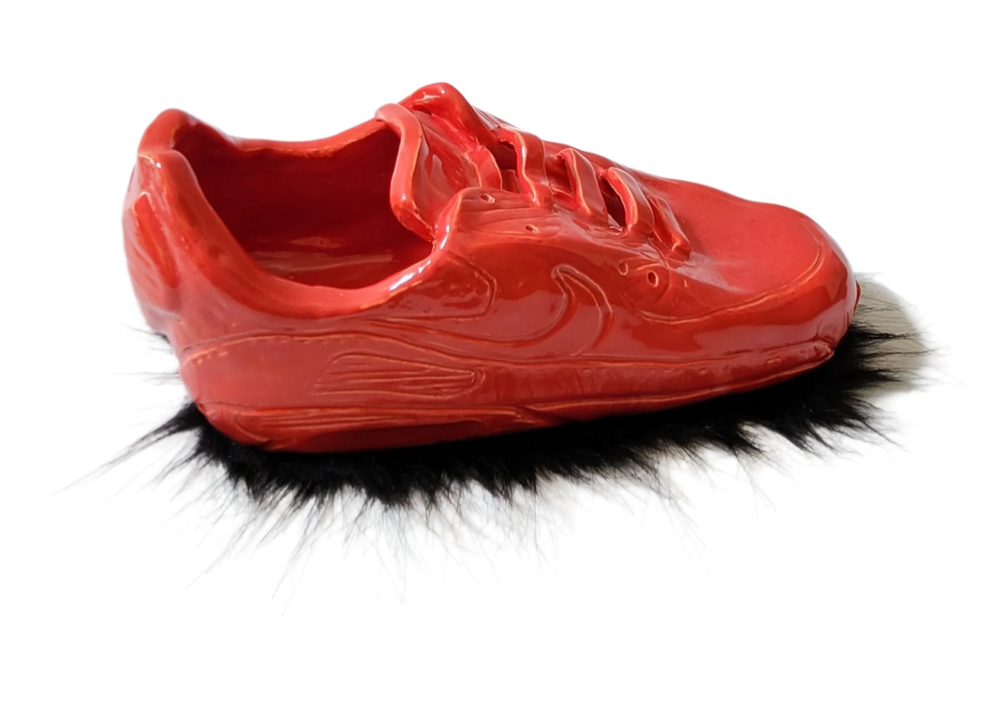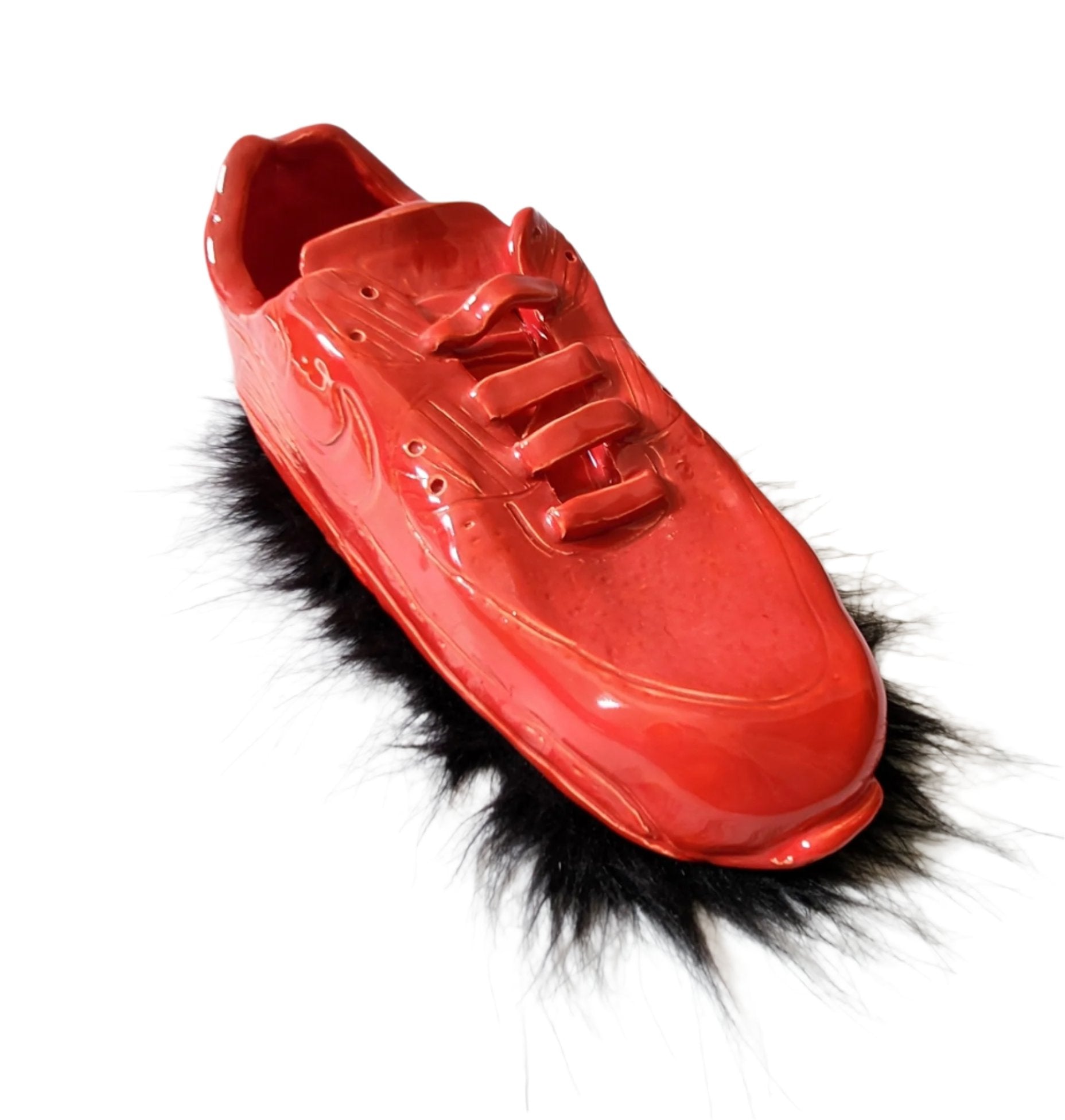 Ceramic handmade Nike Air Max in scarlet gloss with (permanently) attached black furry base.