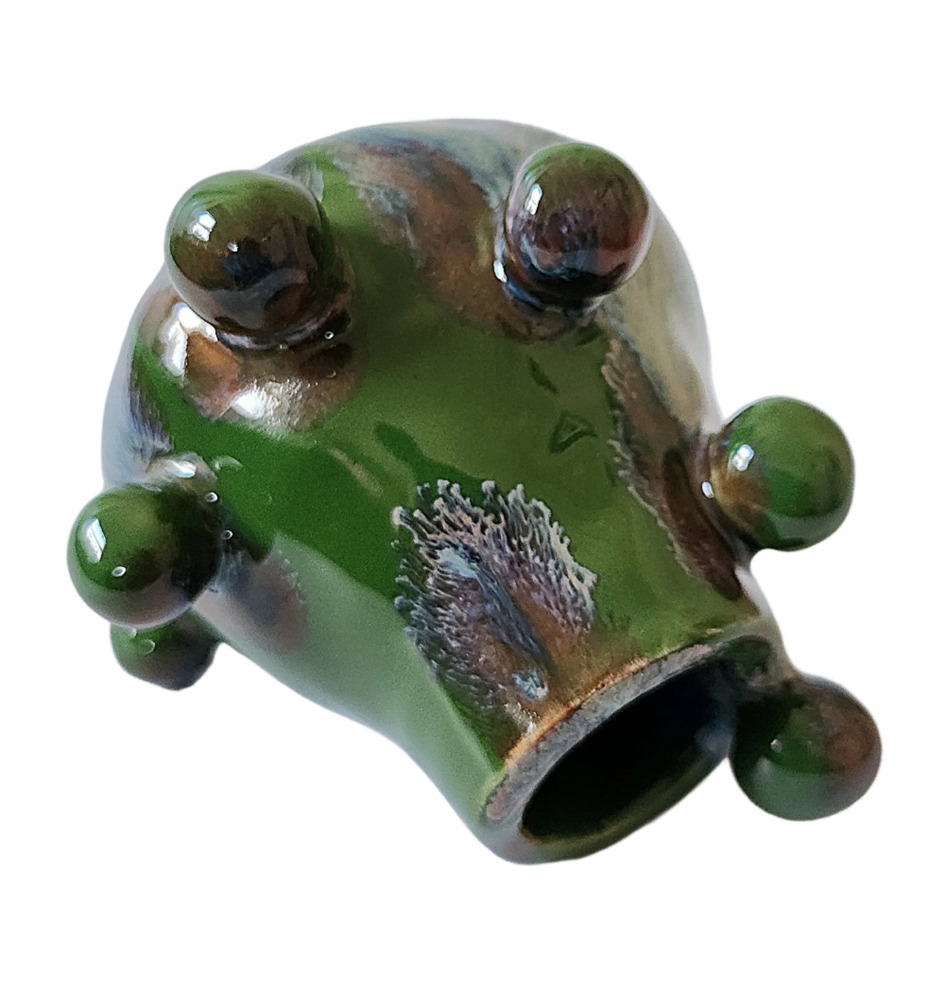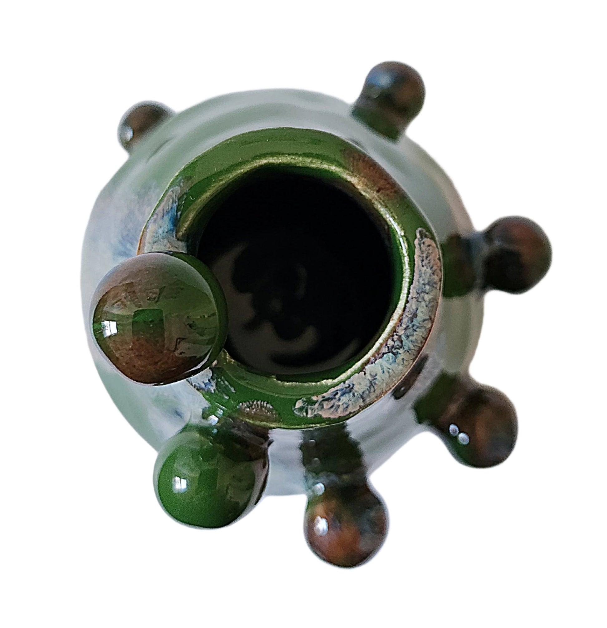 Hand sculpted growth bottle in deep pond green with growth protrusions.