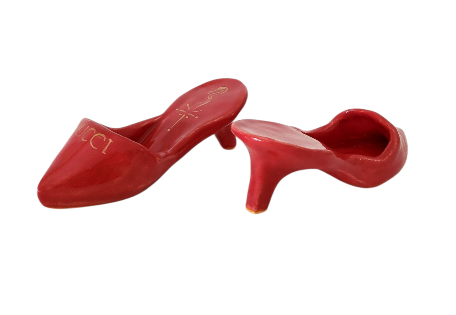 Ceramic replica sculpture of the Gucci mule with gold logo and detailing.