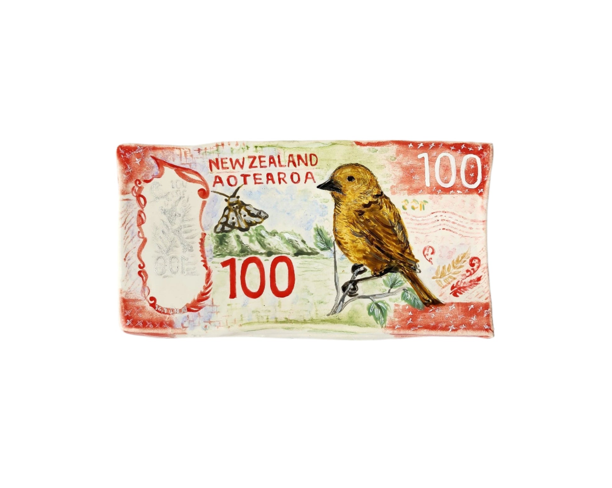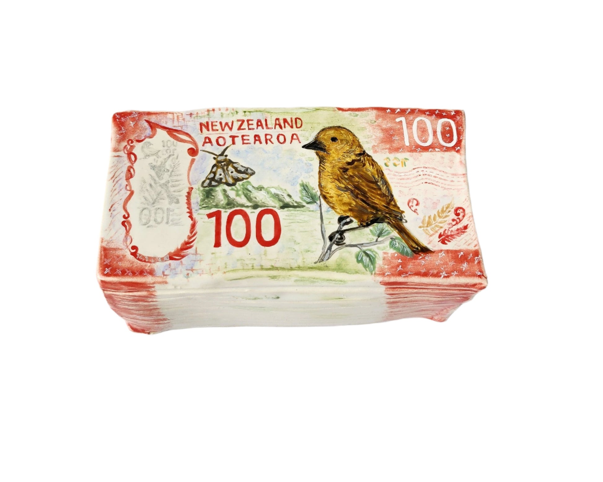 Artist's interpretation of the $100 bank note from Aotearoa, presented here in ceramic as a sculpture stack.