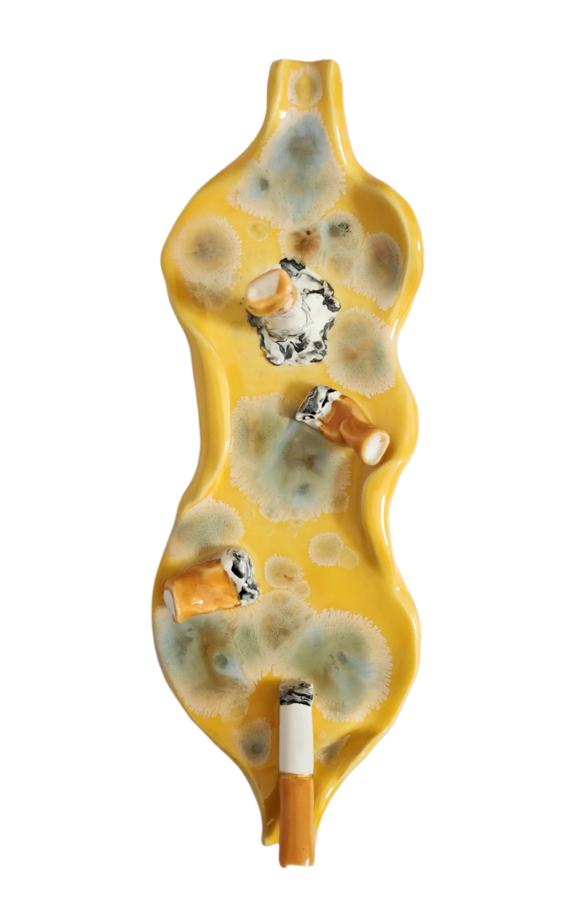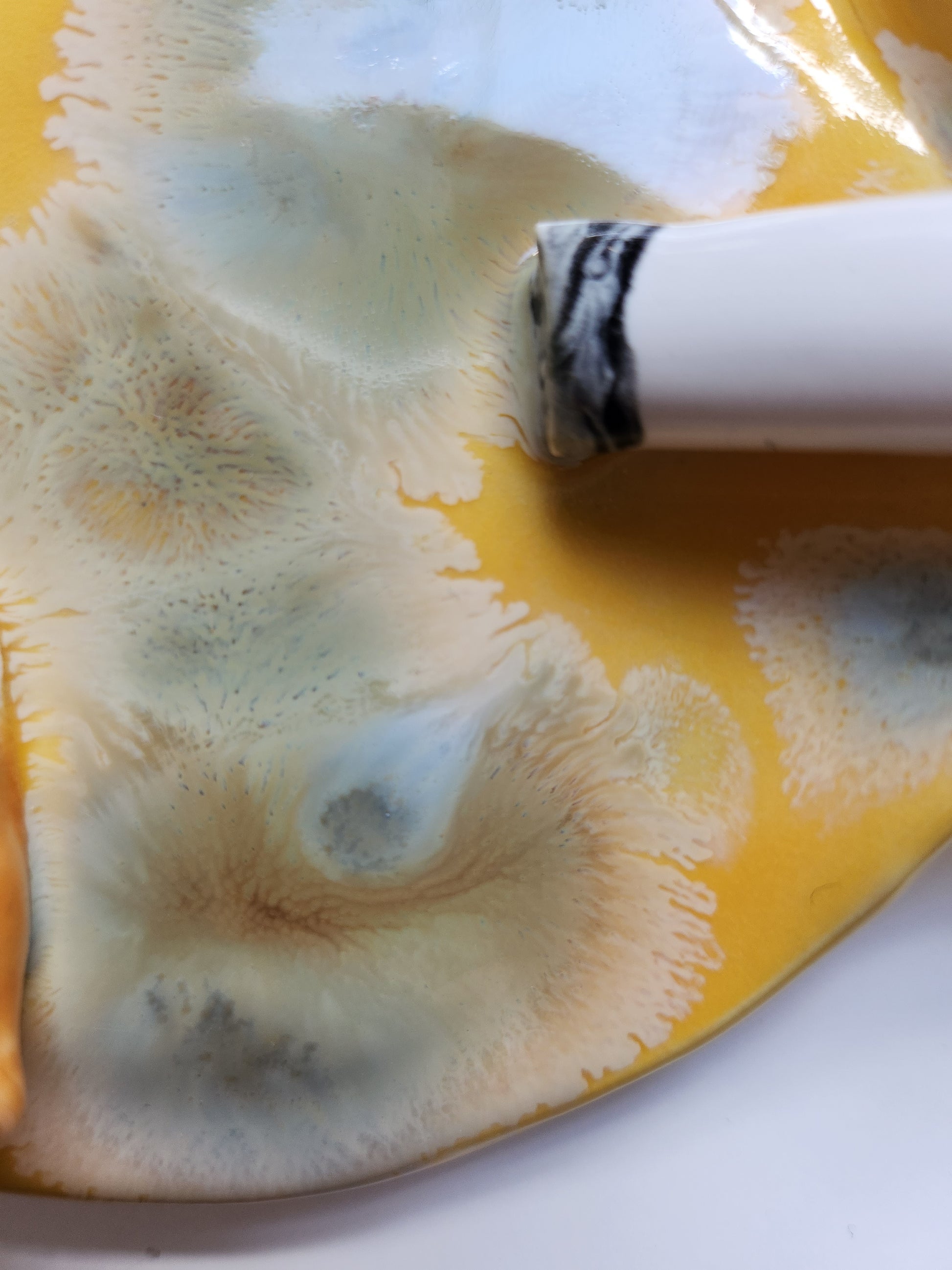 White mid fire clay used with mid fire gloss glaze. Crystal drip glaze used on the tray. Enamel detailing.