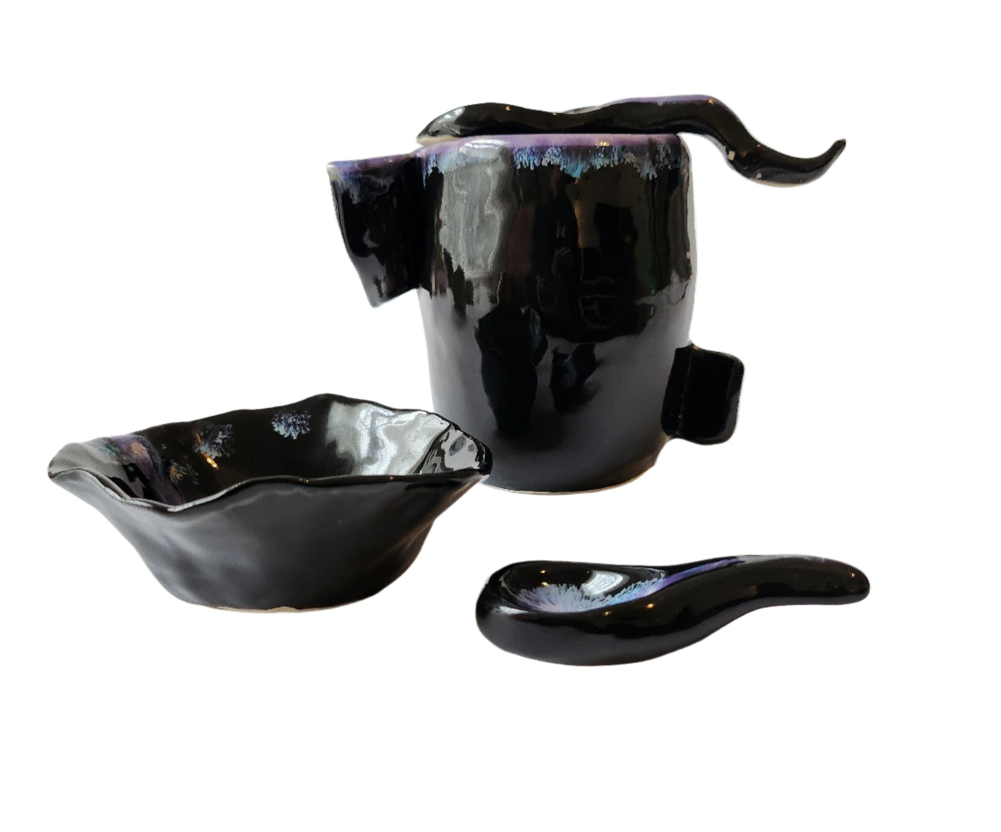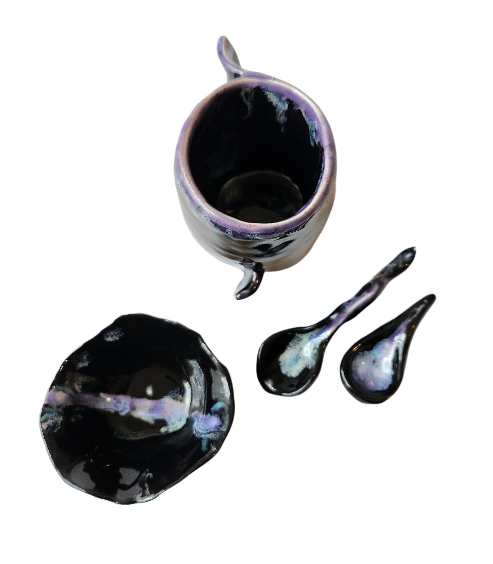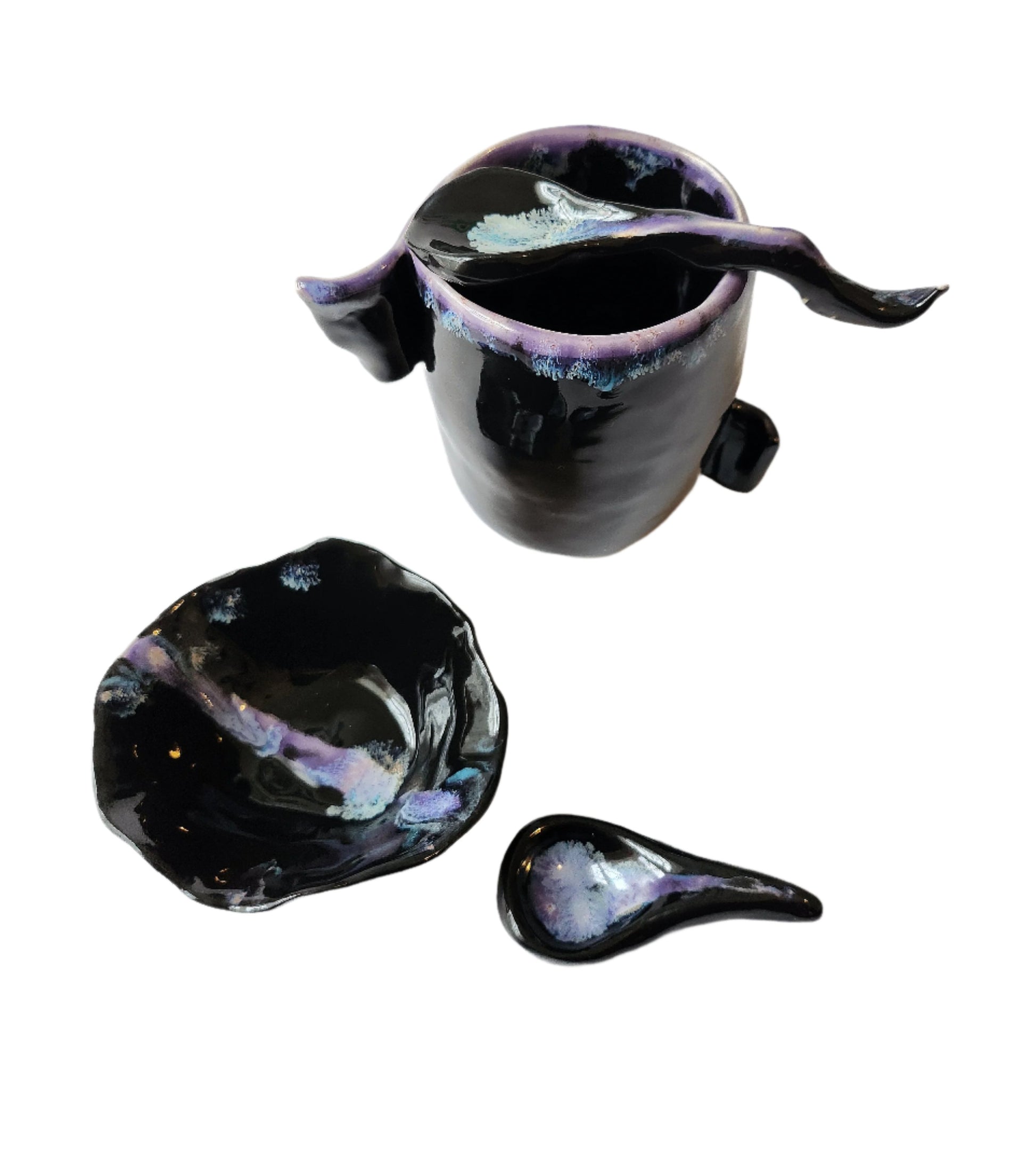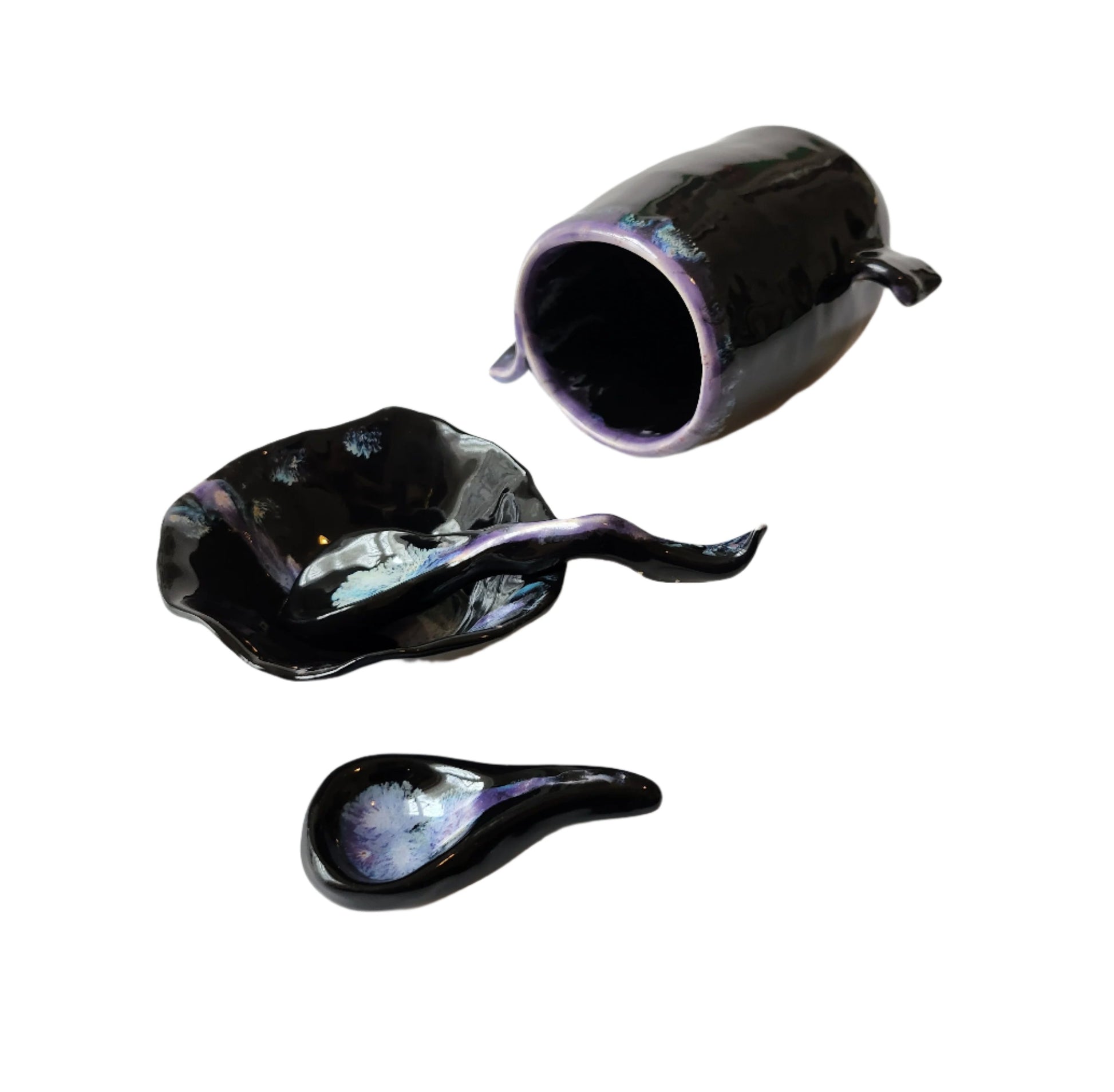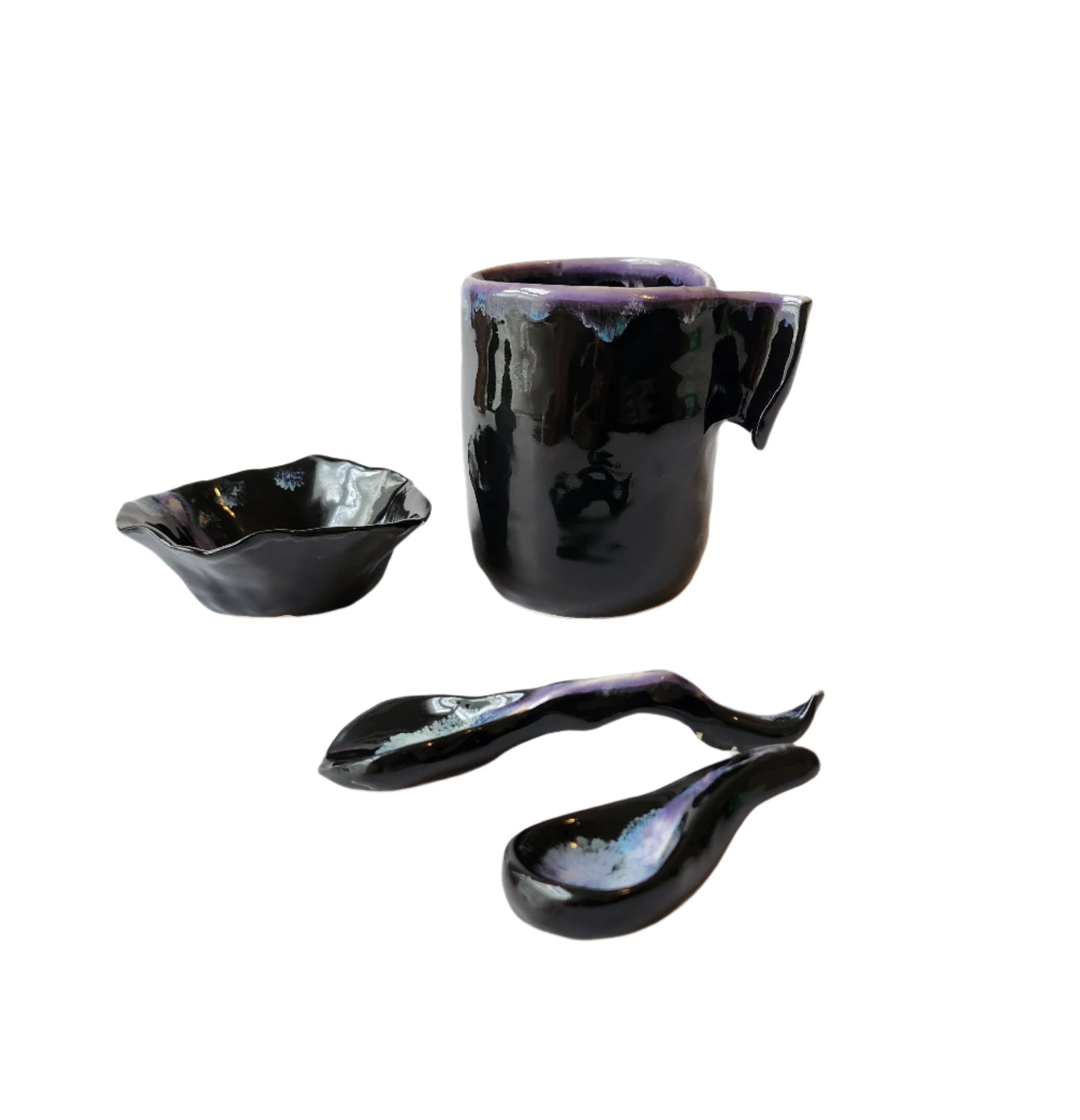 Dripping in deep gloss glaze with form accentuation from crystal lavender glaze.