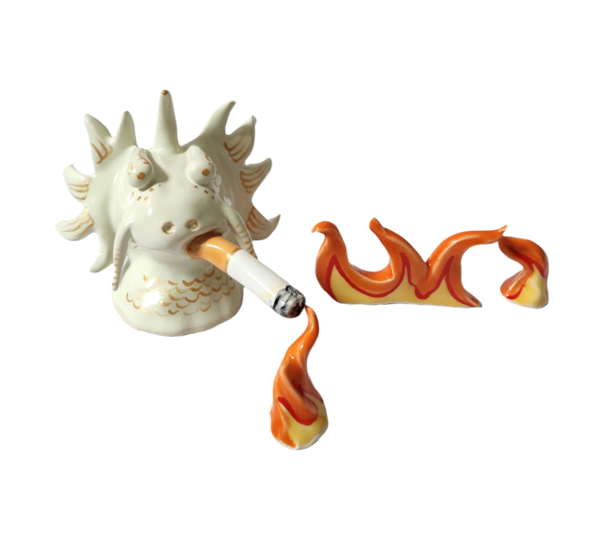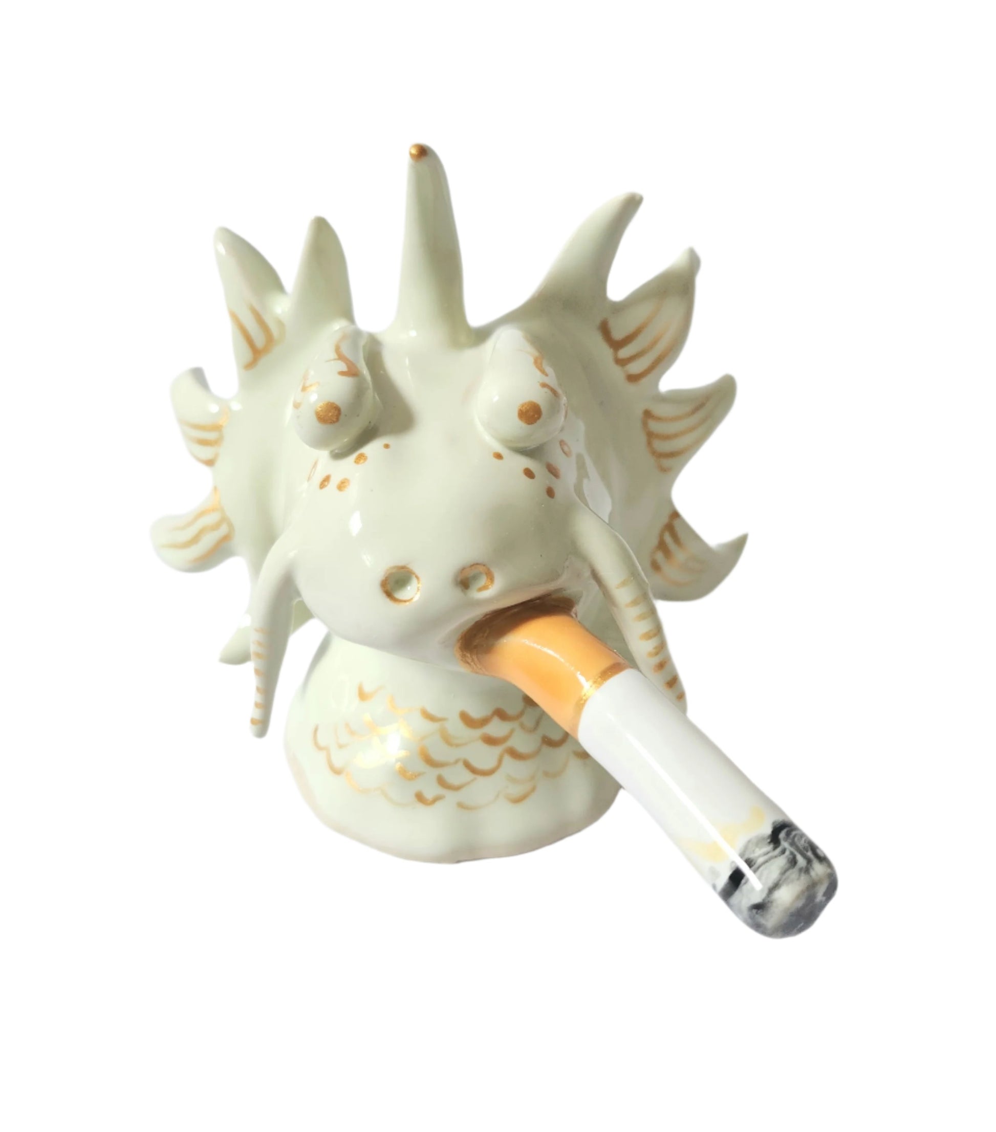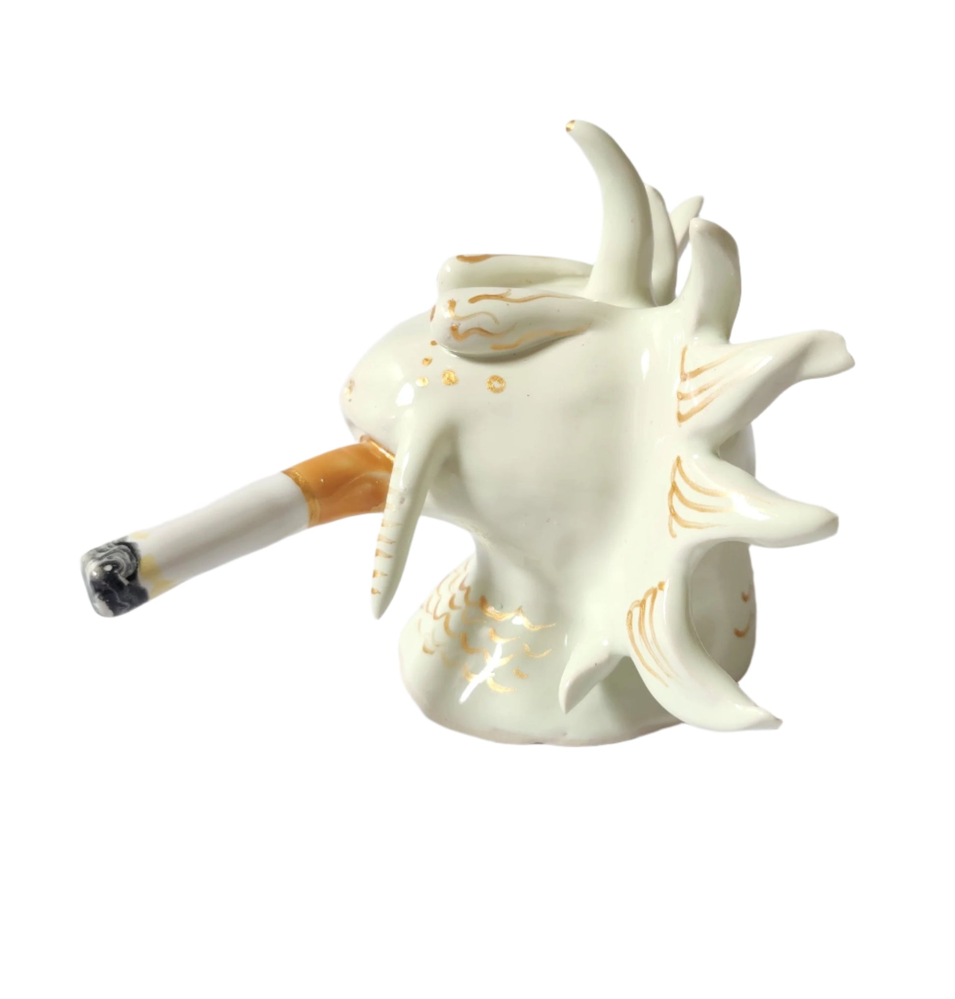 White mid fire clay used with mid fire gloss glaze and enamel detailing.