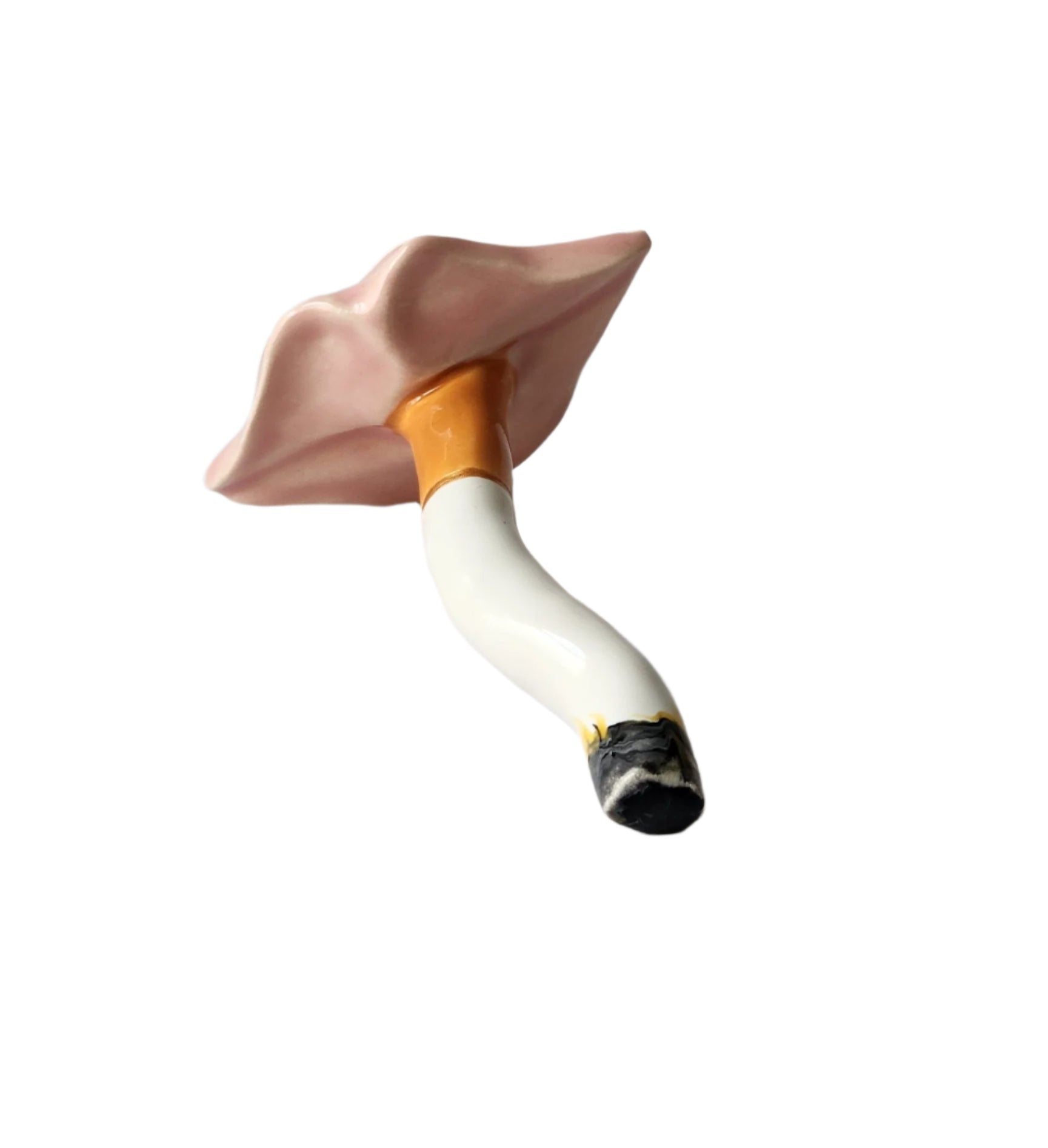 A ceramic sculpture of lips with an attached vertical cigarette.