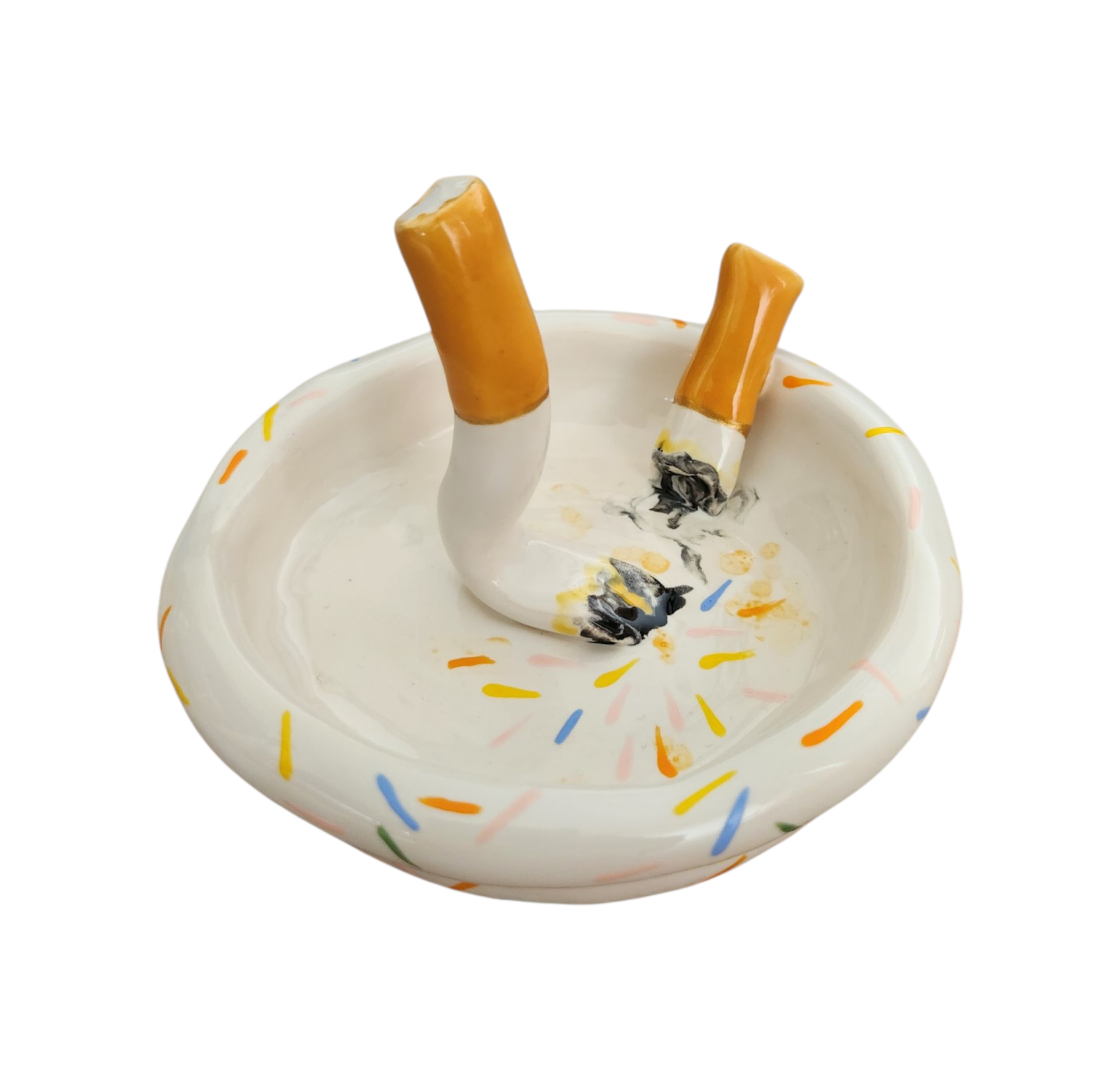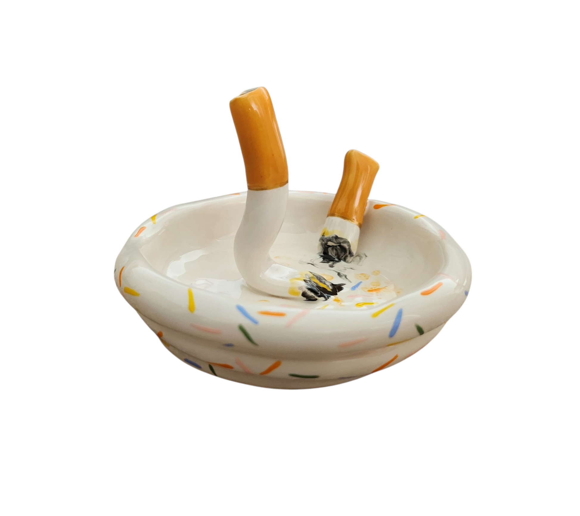 Ceramic ashtray with 2 attached cigarettes nesting in a soft serve dish.