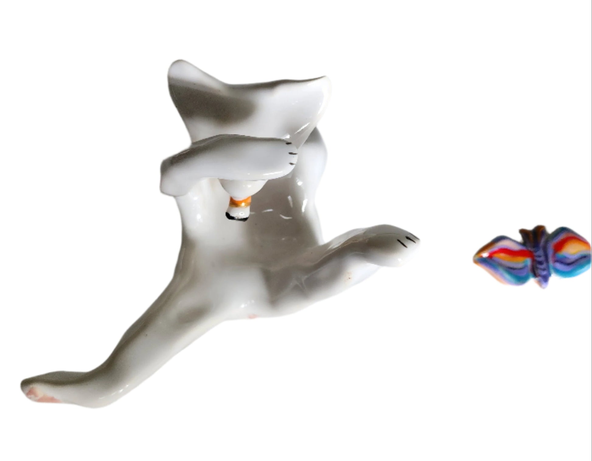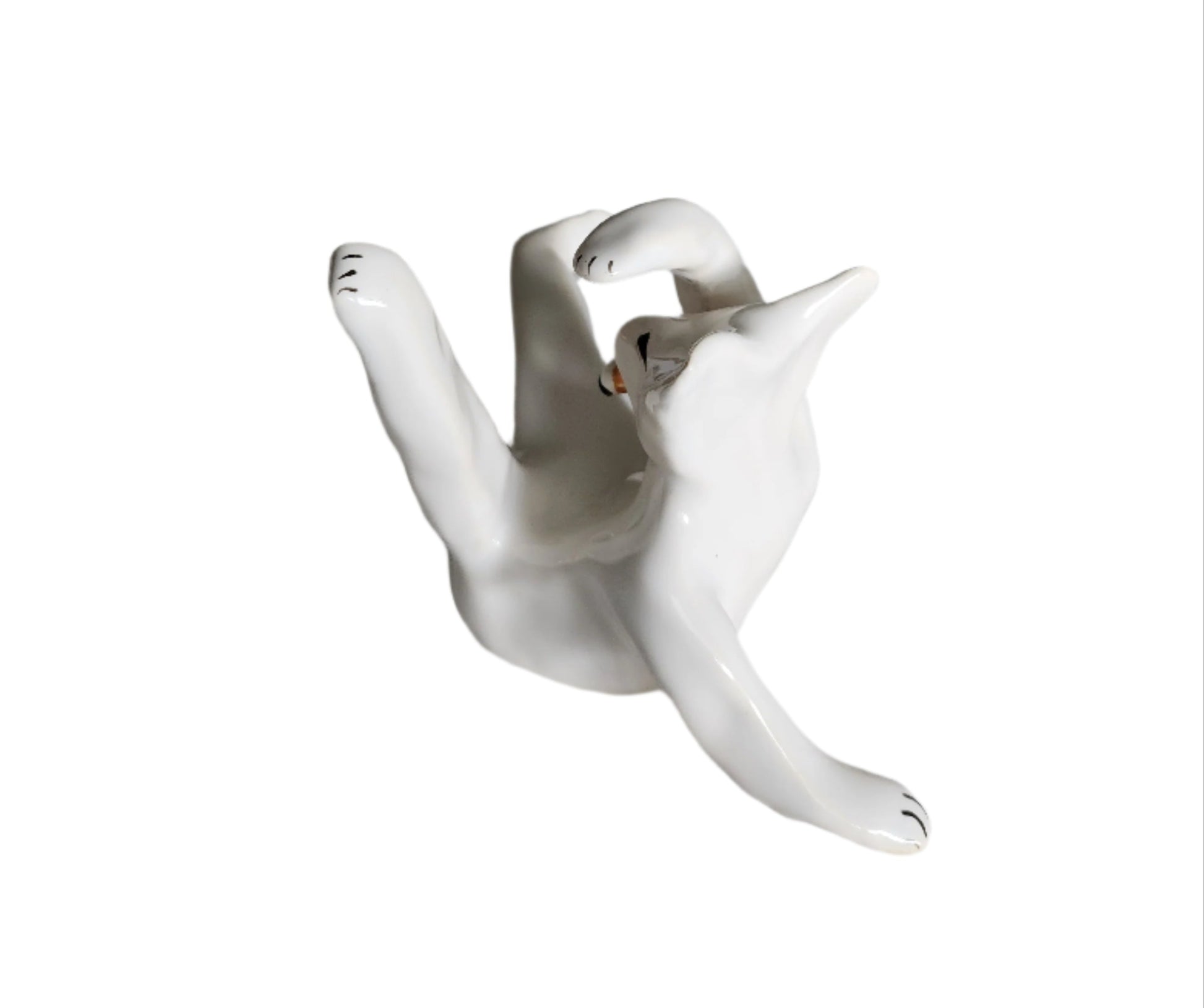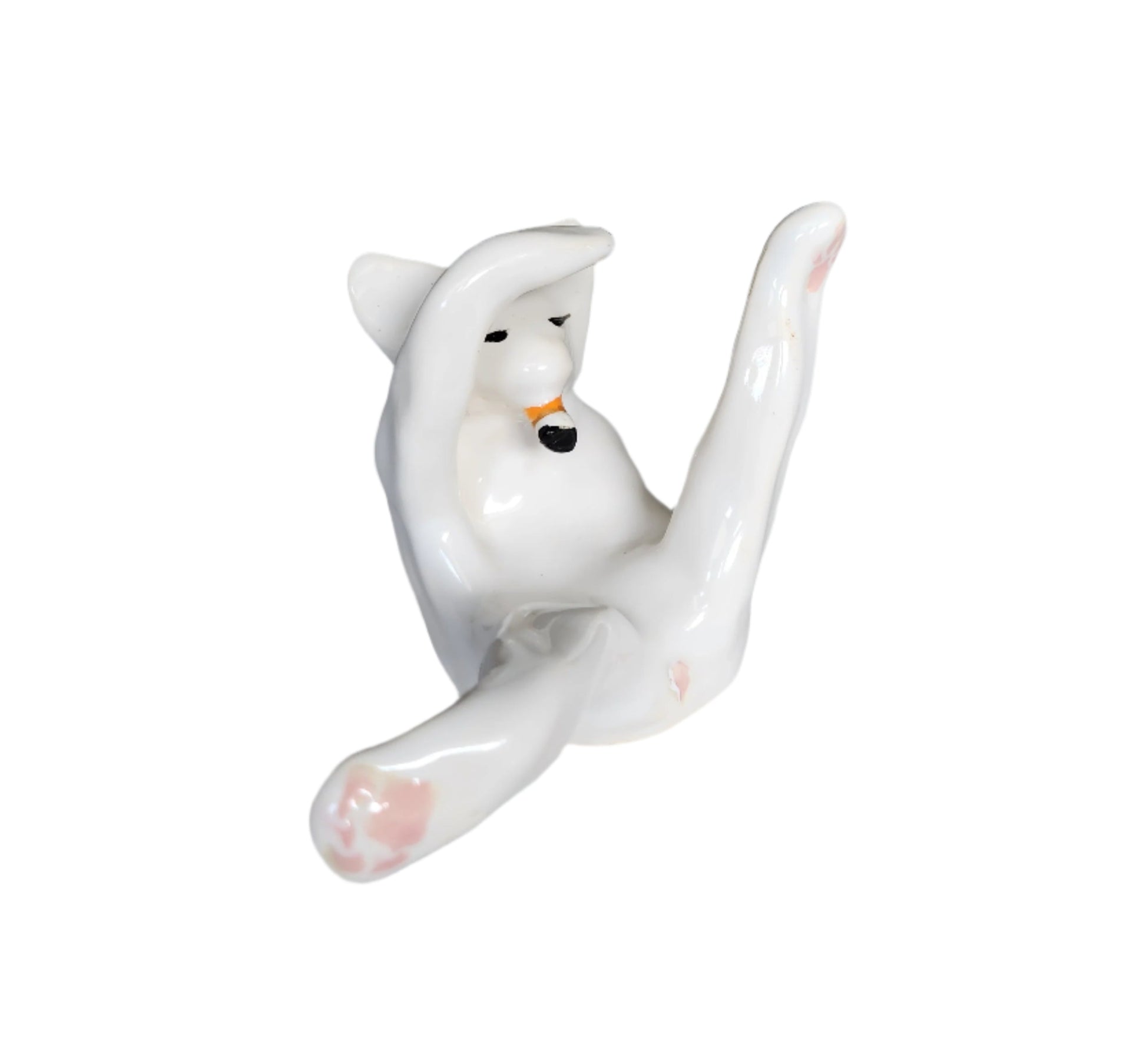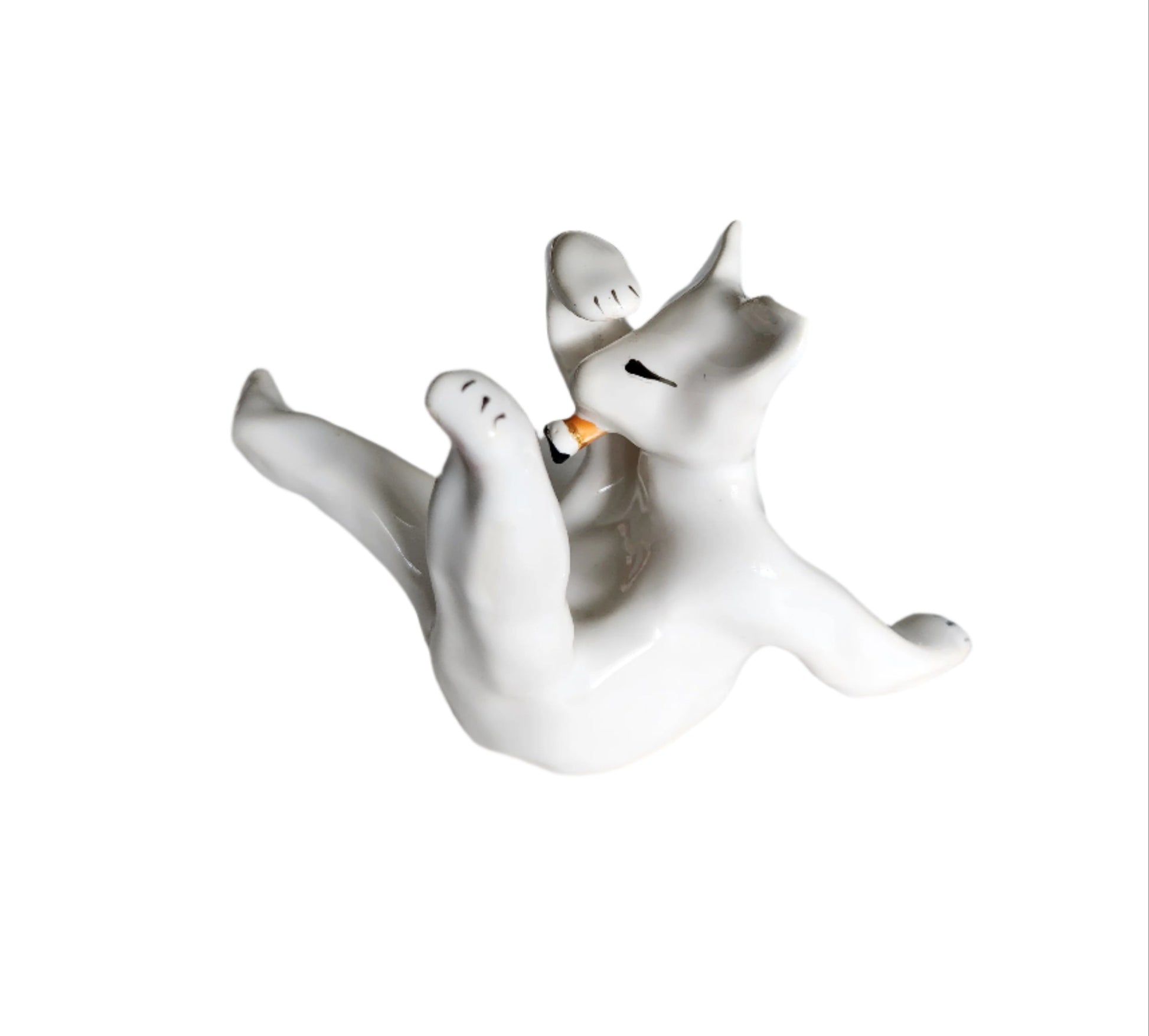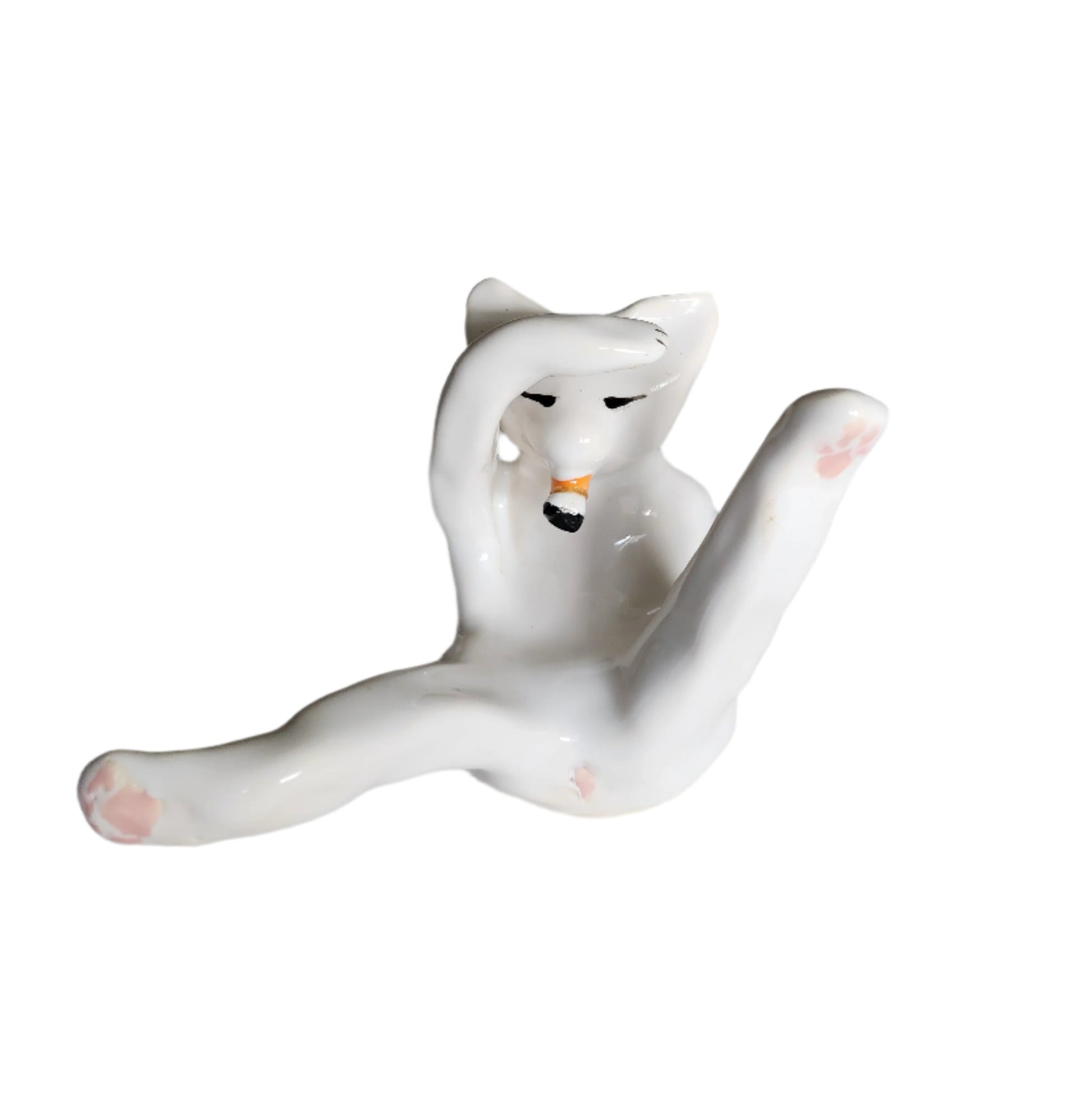 Ceramic sculpture of a cat smoking a cigarette while shielding it's eyes from the sun.