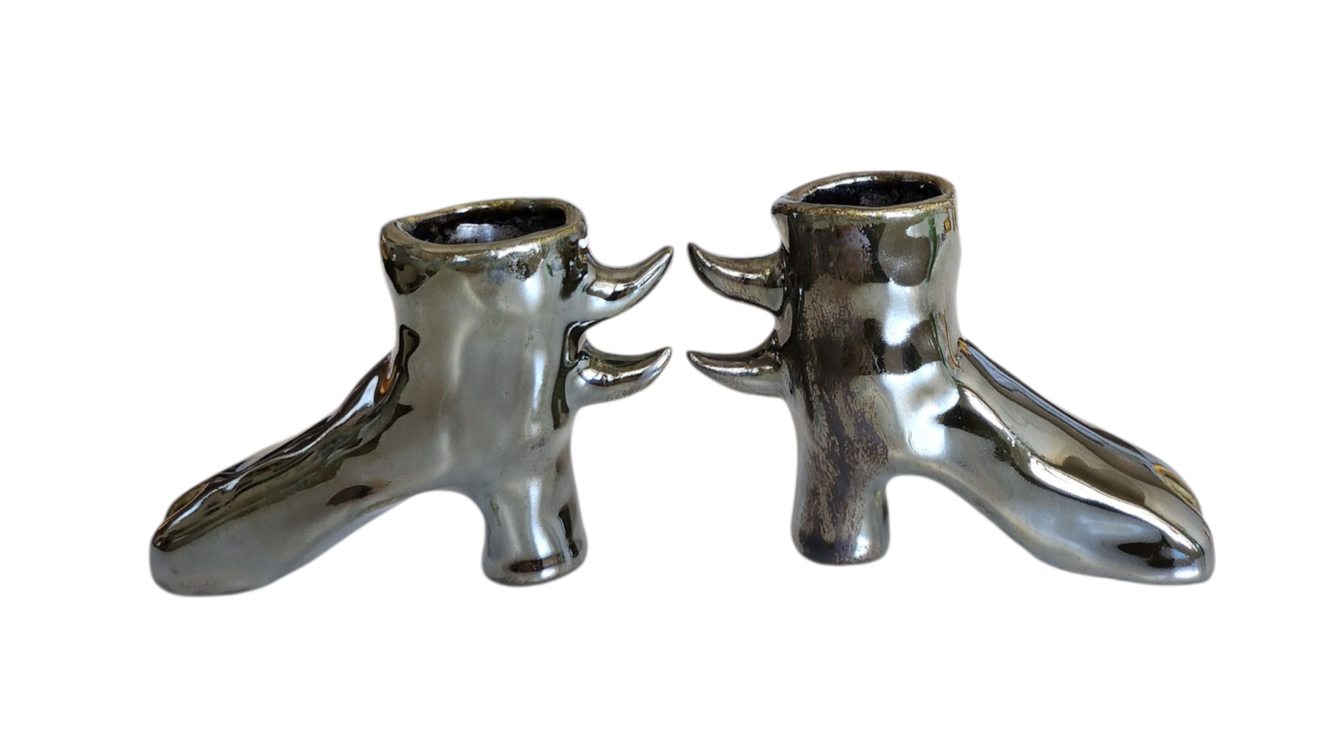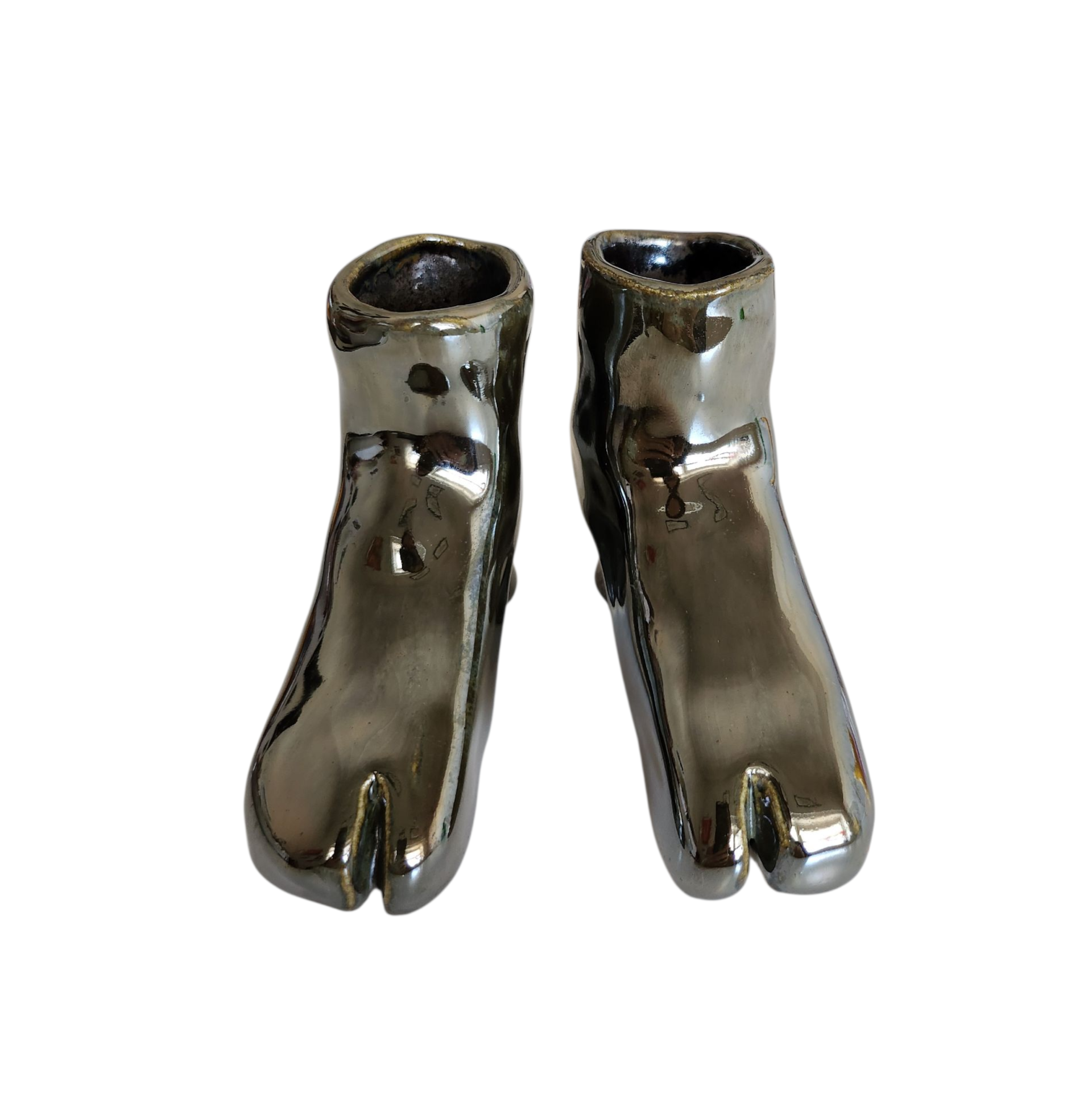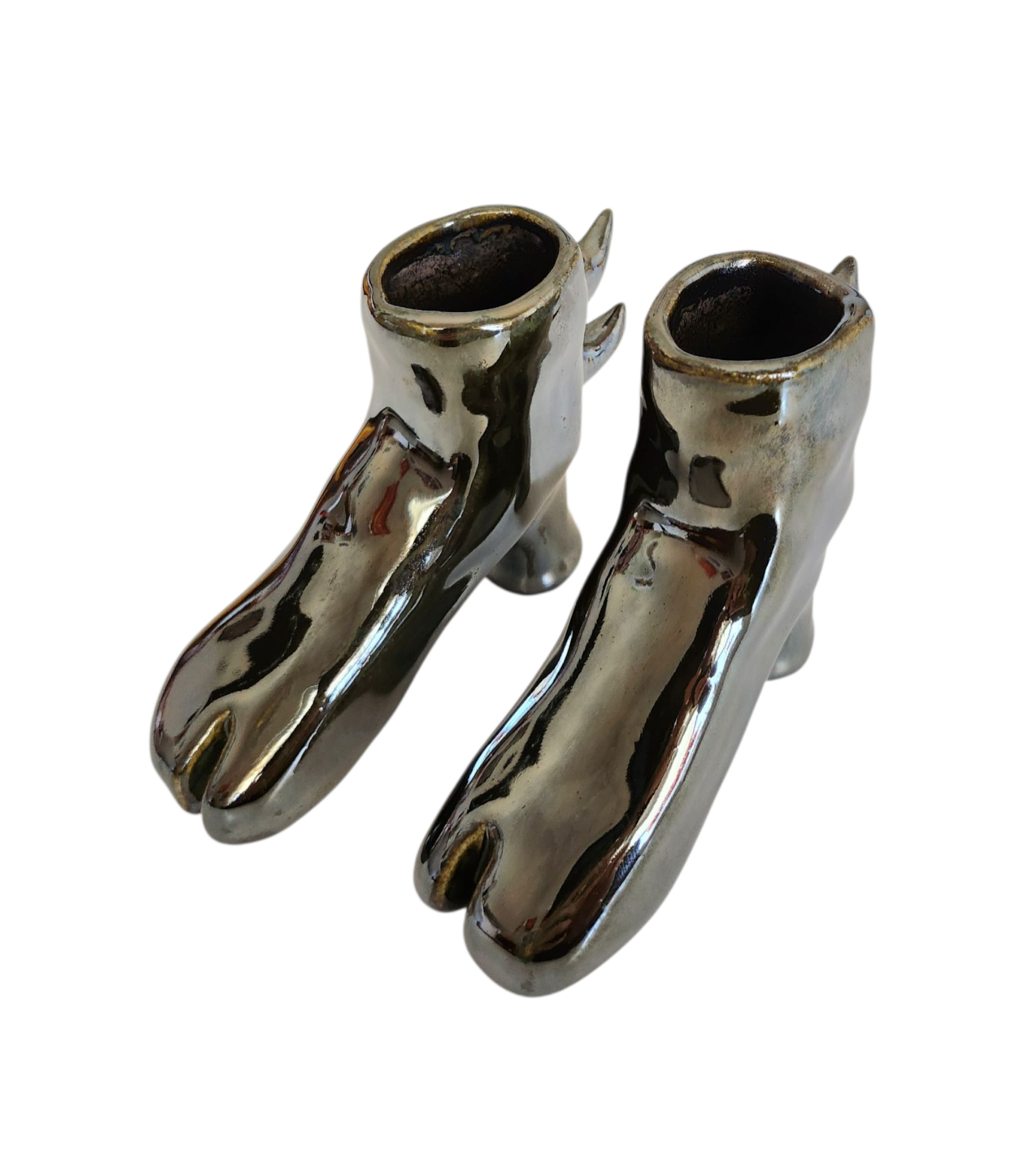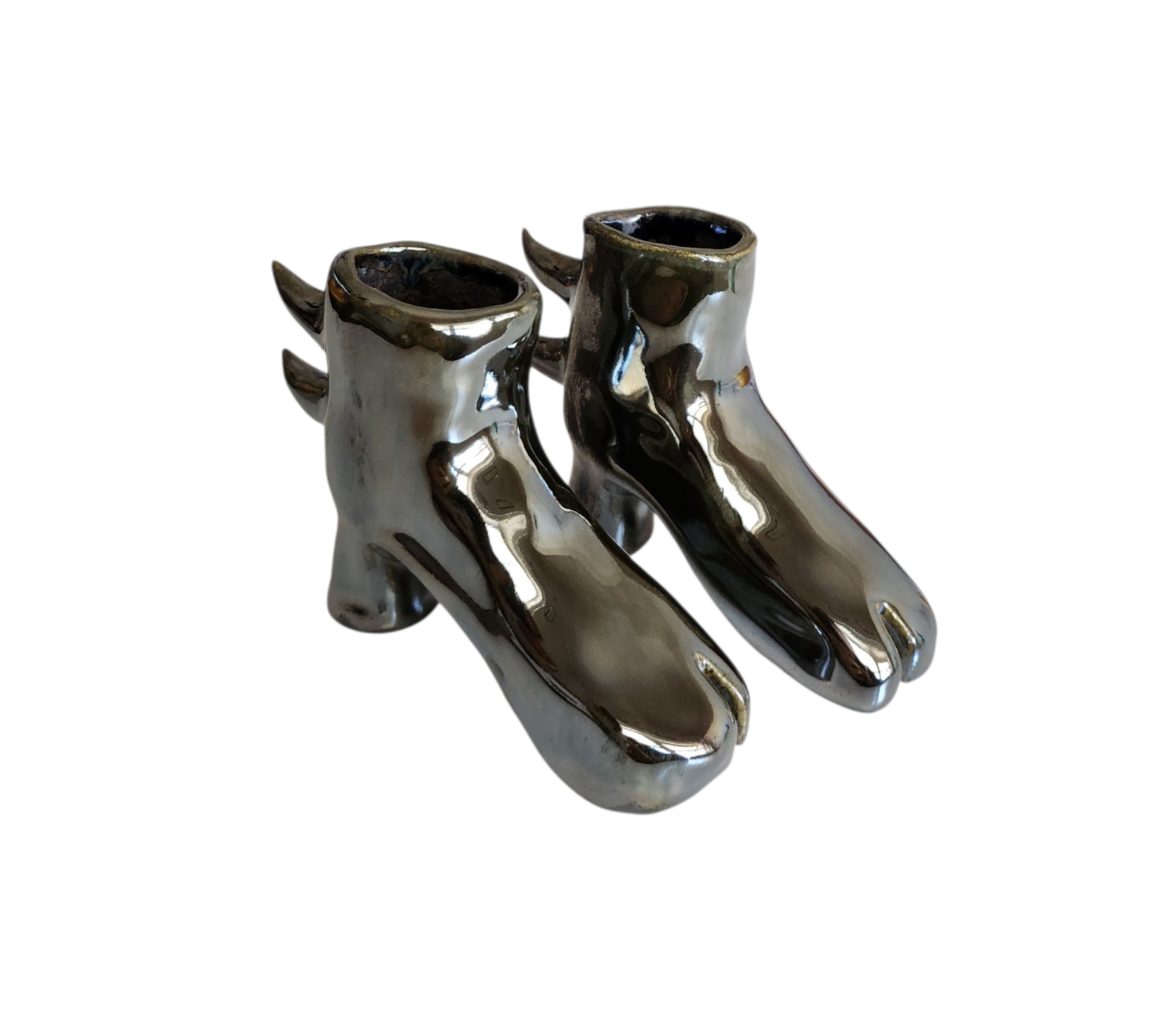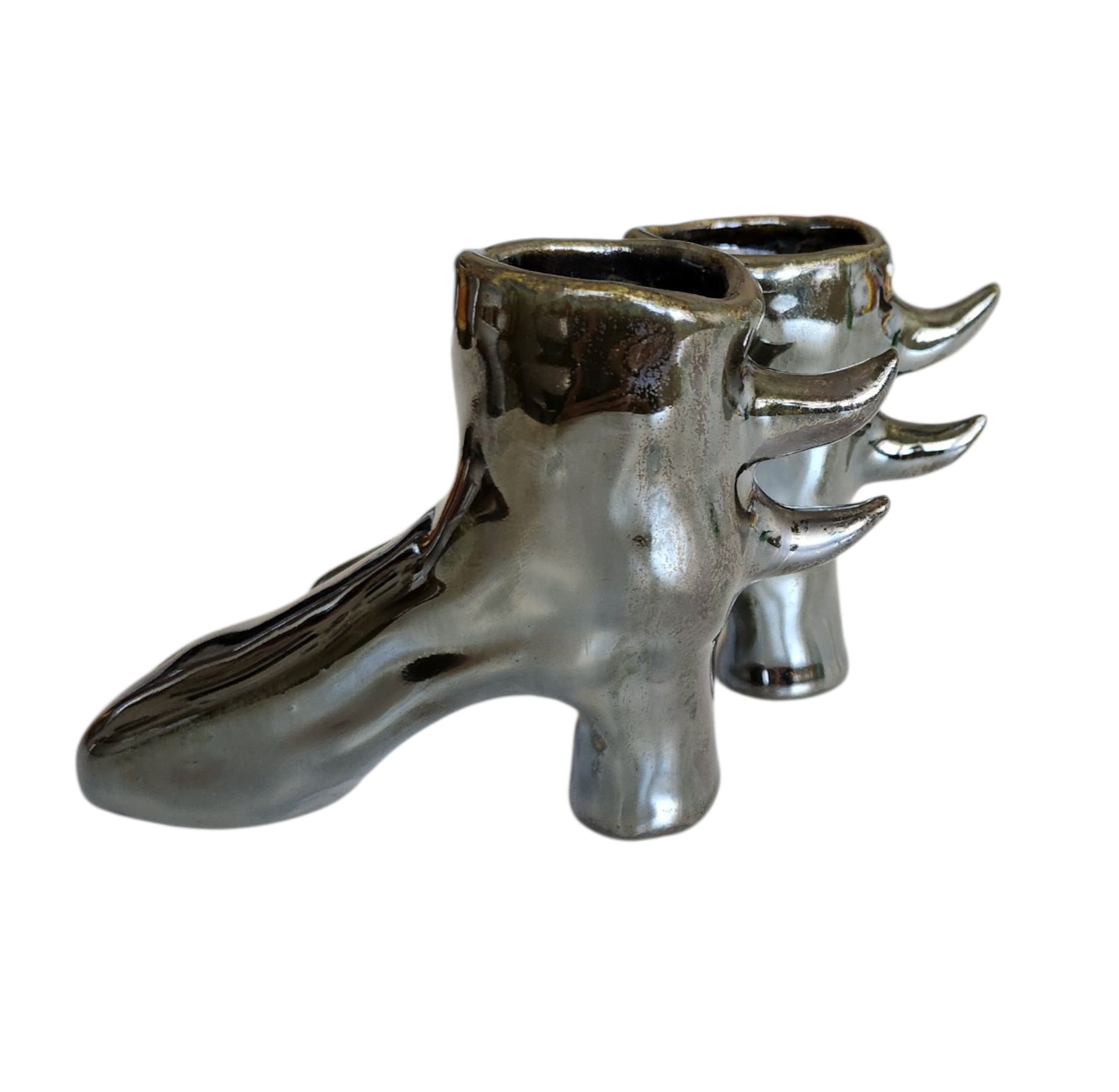 Ceramic replica sculpture of the iconic Tabi boot dressed in liquid mercury glaze and studded with rear spikes.