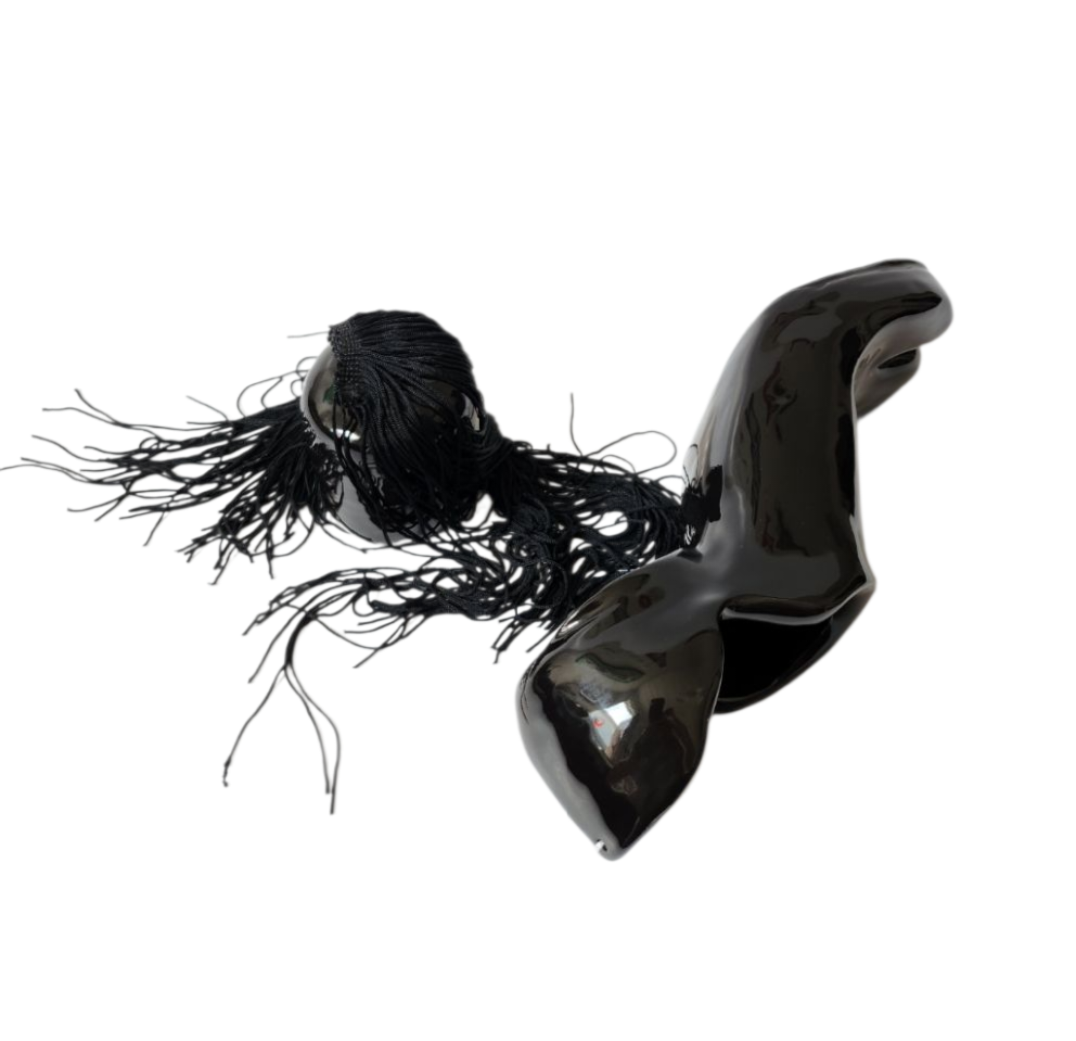 White mid fire clay used with mid fire glaze, white cotton and synthetic fibers (fringing).