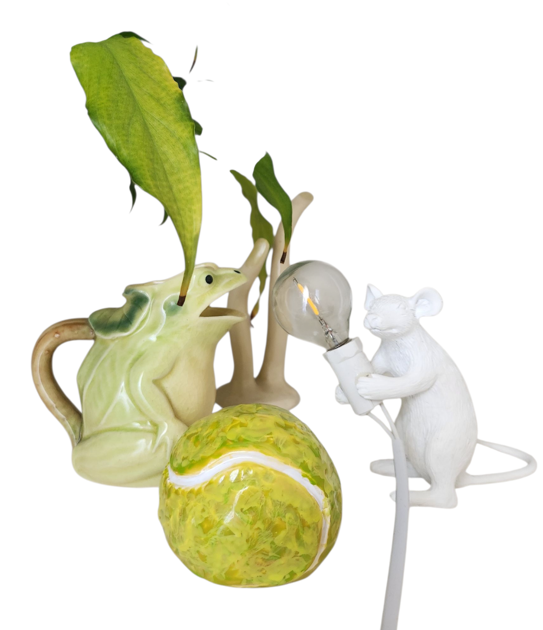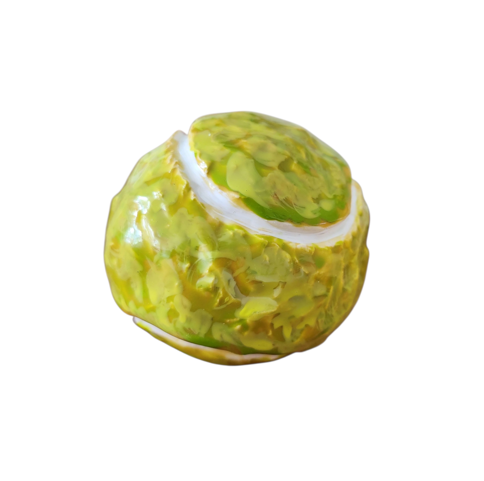 Ceramic sculpture of a tennis ball designed to hang on your wall.